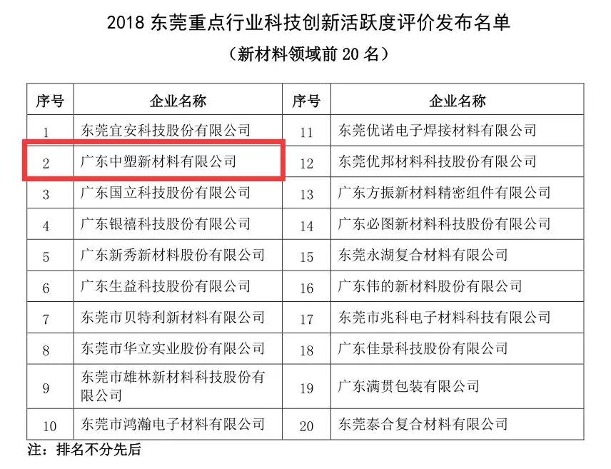 九游老哥J9俱乐部官网新材料凭借多年来持续的创新能力,获评“2018东莞重点行业科技创新活跃度20强”(排名不分先后)。